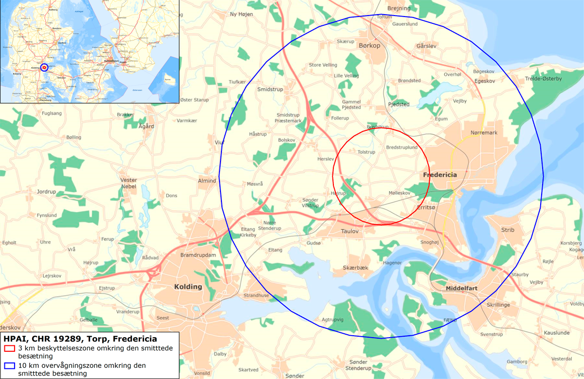 Samtidig vil der blive etableret en beskyttelseszone rundt om gårdens besætning med en radius på tre kilometer og en overvågningszone med en radius på ti kilometer.