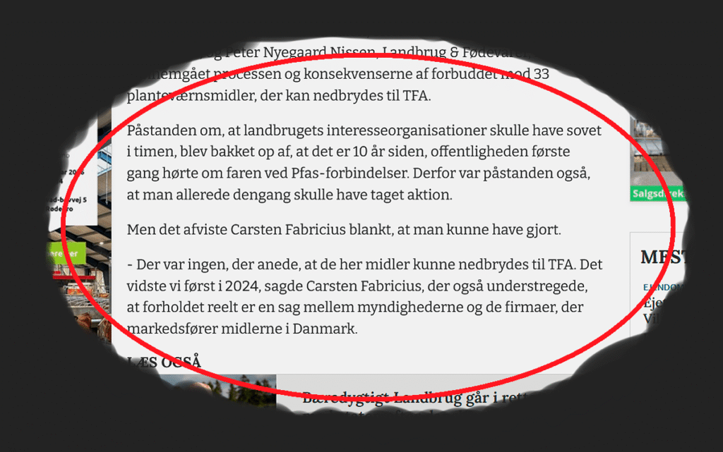 Så hvad går det ud på, når sektordirektør for Landbrug & Fødevarer Planteproduktion Peter Nyegaard Nissen og afdelingsleder Carsten Fabricius fra SEGES Innovation P/S påstår, at de ikke anede, at »de her midler kunne nedbrydes til TFA. Det vidste vi først i 2024«.