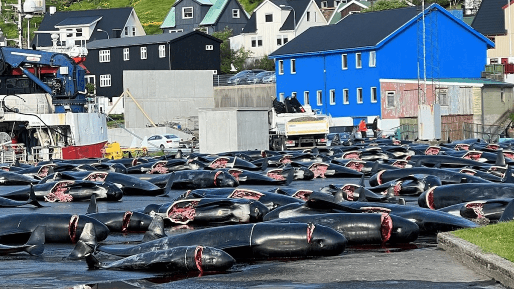 Efter en brutal jagt med knive, kroge og lanser på Færøerne er mindst 446 grindehvaler drevet sammen og slået ihjel. World Animal Protection kalder det en brutal massakre og en skamplet på Færøernes internationale omdømme.
