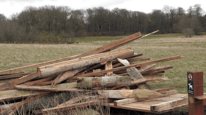 Men det betyder ikke, at tiden står stille. Den 31. marts kunne jeg se, at et shelter fra grillpladsen ved Strødam Engsø lå som en stor bunke affaldstræ ved broen ved Fruebjergvej. Dagen efter blev bunken øget med de meget populære borde og bænke, der har stået på diget ved Strødam Engsø. Grillarrangement af jern lå også i bunken i dag.